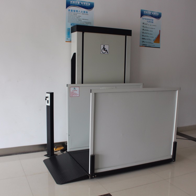 无障碍残疾人升降平台由升降平台、导轨和驱动箱等三大部分组成;升降平台是 由C型钢材为主体部件,采用“翘板自复位开关操作运行”, 无基坑式安装,直接固定于混凝土地面(无底坑室外应用情况下,平台下方混凝土地面不得低于周围地面) ,手动液压阀打开时升降底板能手动下降;液压驱动,升降平稳安全,外部采用拉丝不锈钢材料和铝板静电喷塑机箱/面板,外形小巧美观,不阻碍周边环境。残疾人升降机直接安装于地面,无需土建配套地坑,施工简便,产品放置户外不易积水,不易生锈,维护简便。